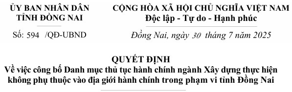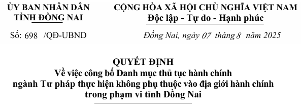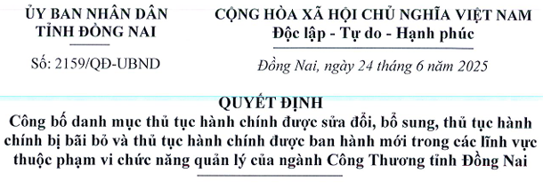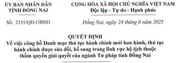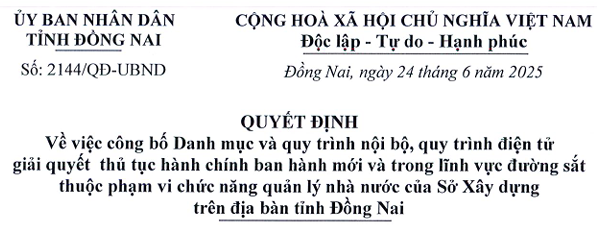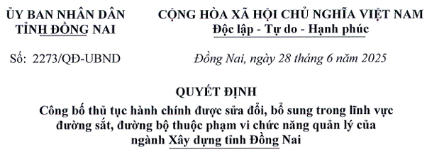 QUYẾT ĐỊNH CÔNG BỐ THỦ TỤC HÀNH CHÍNH CỦA UBND ĐỒNG NAI BAN HÀNH