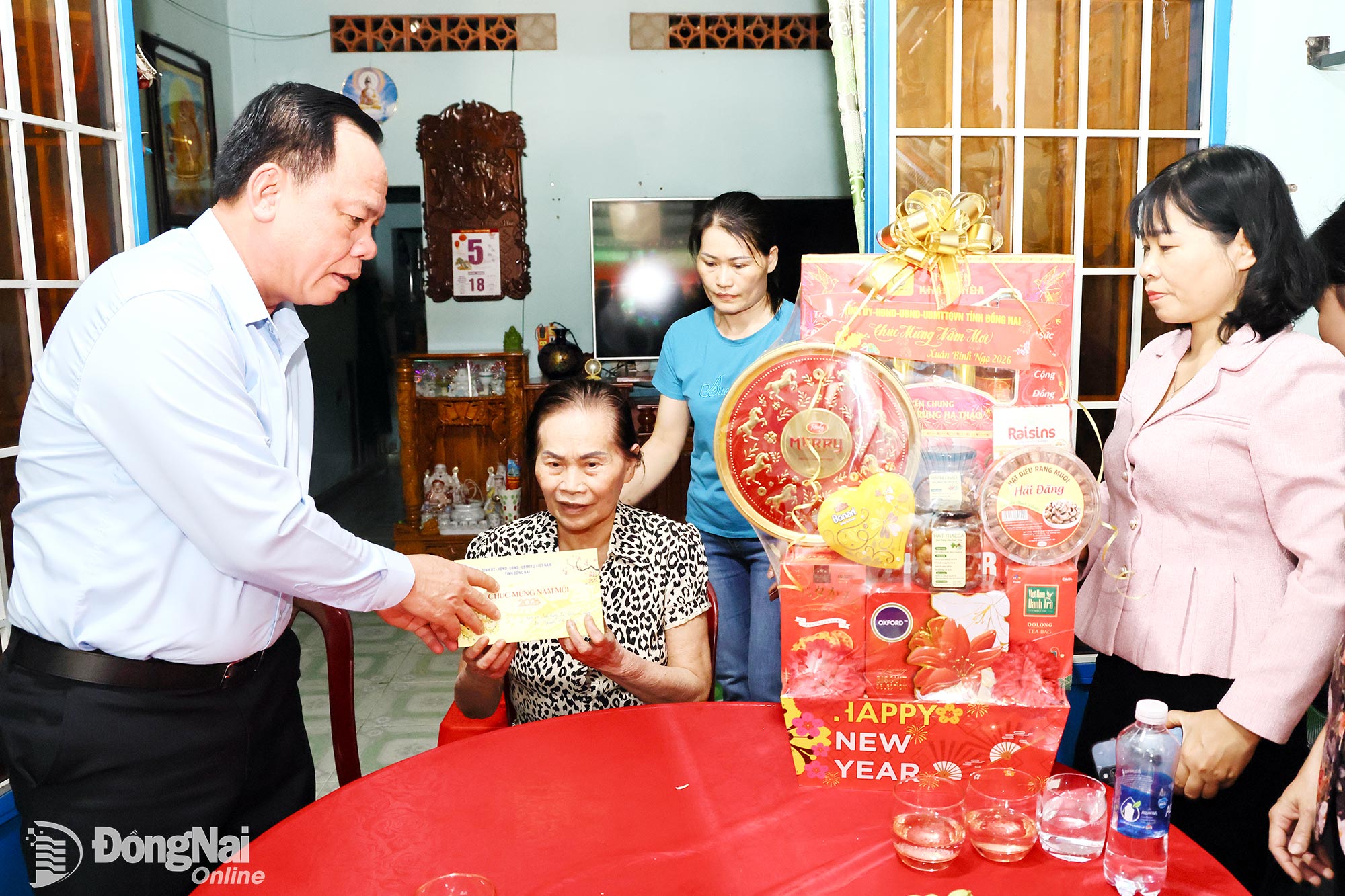 Phó Bí thư Tỉnh ủy Đồng Nai Võ Tấn Đức tặng quà và chúc Tết Anh hùng Lực lượng vũ trang nhân dân Nguyễn Thị Bằng. Ảnh: Công Nghĩa