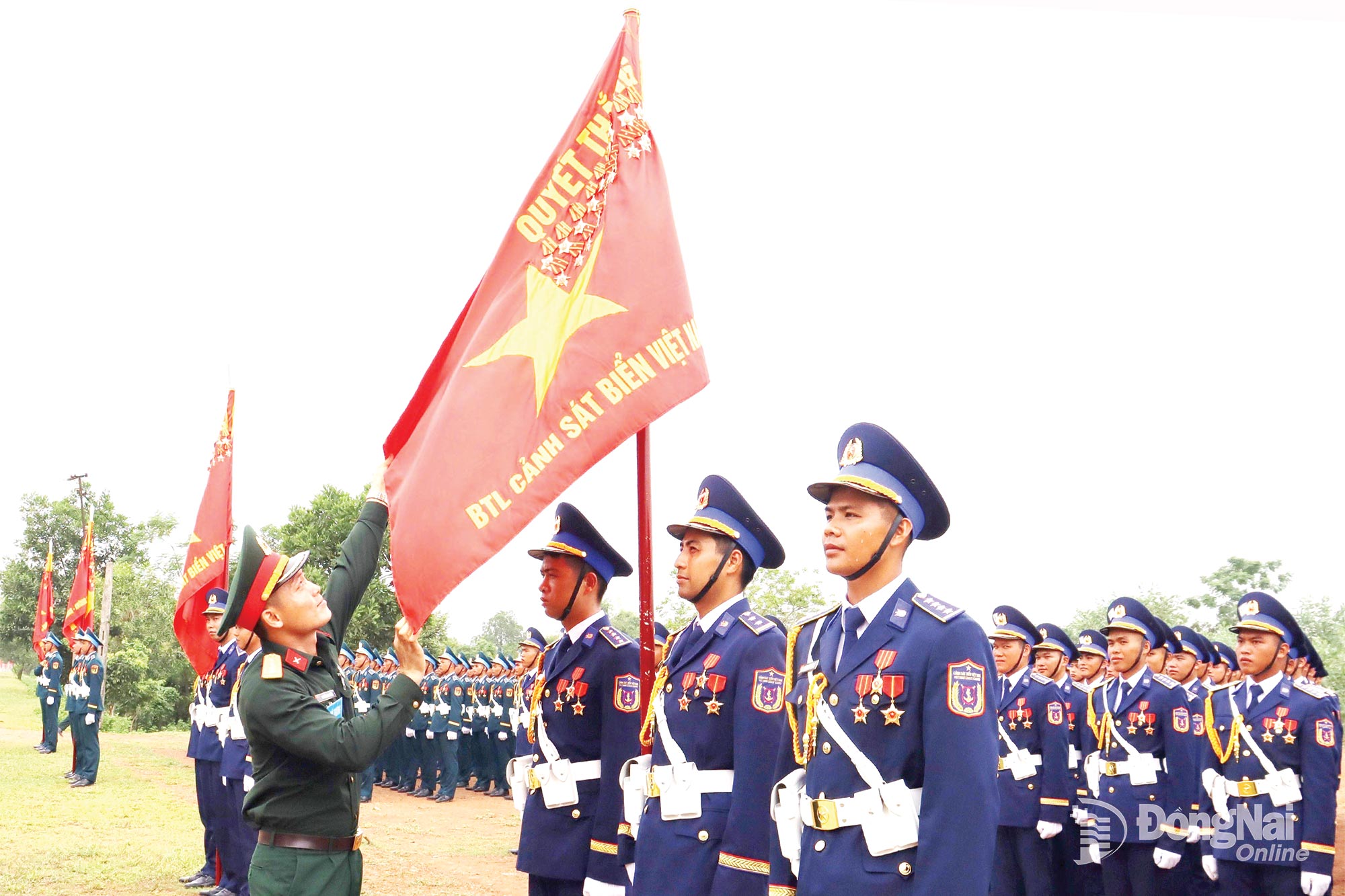 Phụ trách Khối huấn luyện Nam sĩ quan cảnh sát biển chỉnh sửa cờ giúp các chiến sĩ trong quá trình tập luyện để phục vụ ngày đại lễ. Ảnh: Nguyệt Hà |