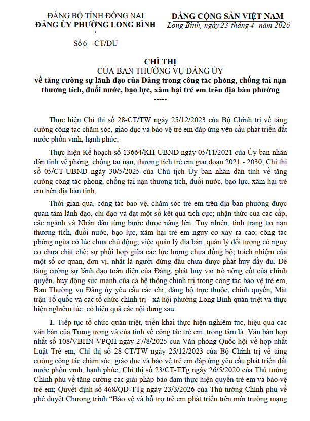 <p>Toàn văn Chỉ thị 06-CT/ĐU của Ban Thường vụ Đảng ủy phường Long Bình về tăng cường sự lãnh đạo của Đảng trong công tác phòng, chống tai nạn thương tích, đuối nước, bạo lực, xâm hại trẻ em trên địa bàn.</p><figure class="image"><img style="aspect-ratio:612/830;" src="https://longbinh.dongnai.gov.vn/uploads/longbinh/news/2026_04/image_4.png" width="612" height="830" /></figure><p>&nbsp;</p><figure class="image"><img style="aspect-ratio:607/839;" src="https://longbinh.dongnai.gov.vn/uploads/longbinh/news/2026_04/image_5.png" width="607" height="839" /></figure><figure class="image"><img style="aspect-ratio:603/835;" src="https://longbinh.dongnai.gov.vn/uploads/longbinh/news/2026_04/image_6.png" width="603" height="835" /></figure><figure class="image"><img style="aspect-ratio:594/842;" src="https://longbinh.dongnai.gov.vn/uploads/longbinh/news/2026_04/image_7.png" width="594" height="842" /></figure><figure class="image"><img style="aspect-ratio:597/833;" src="https://longbinh.dongnai.gov.vn/uploads/longbinh/news/2026_04/image_8.png" width="597" height="833" /></figure>