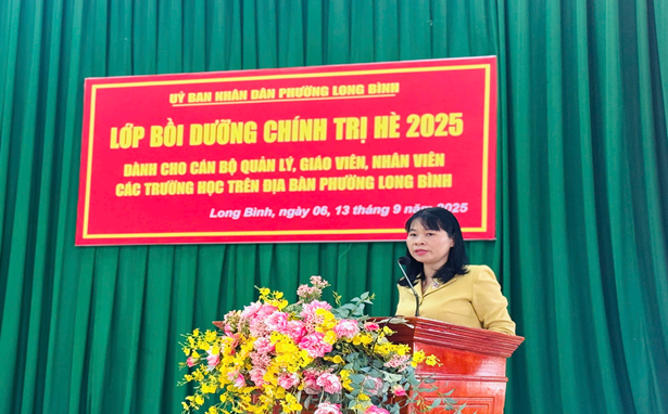 Sáng 06/9/2025 UBND phường phối hợp với Ban xây dựng Đảng phường Long Bình tổ chức khai mạc lớp bồi dưỡng, tập huấn chính trị hè cho cán bộ quản lý, giáo viên, nhân viên các trường học trên địa bàn phường. Bồi dưỡng, tập huấn chính trị hè năm 2025 được tổ chức 04 lớp, thời gian từ ngày 06 - 13/9/2025 cho 1.086 cán bộ quản lý, giáo viên và nhân viên của 18 cơ sở giáo dục trên địa bàn phường.